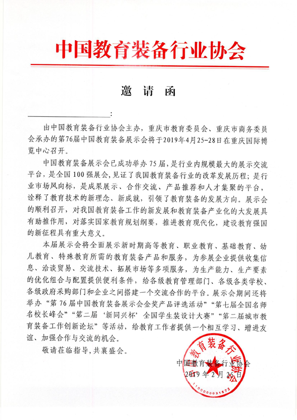 主辦單位:中國教育裝備行業協會   展會時間:2019年4月26日至28日   展會地點:中國·重慶國際博覽中心