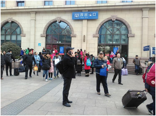 志愿者在青島站到達出口舉牌接站,接到來賓后,步行前往停車場,抵達交通車乘車點(東西出站口均有志愿者引導至循環交通車)。