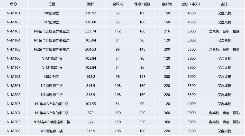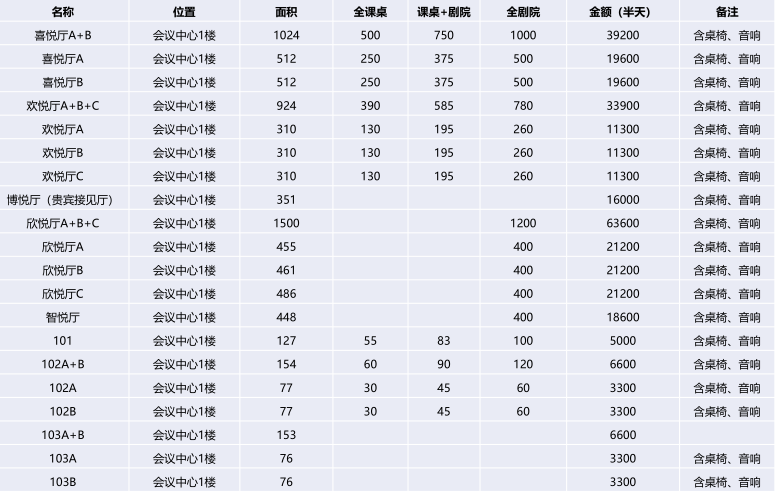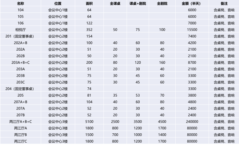 注:以上價格僅包括租賃會議室場地費,其他的各類設備(如:投影儀)費用需現場另行支付。