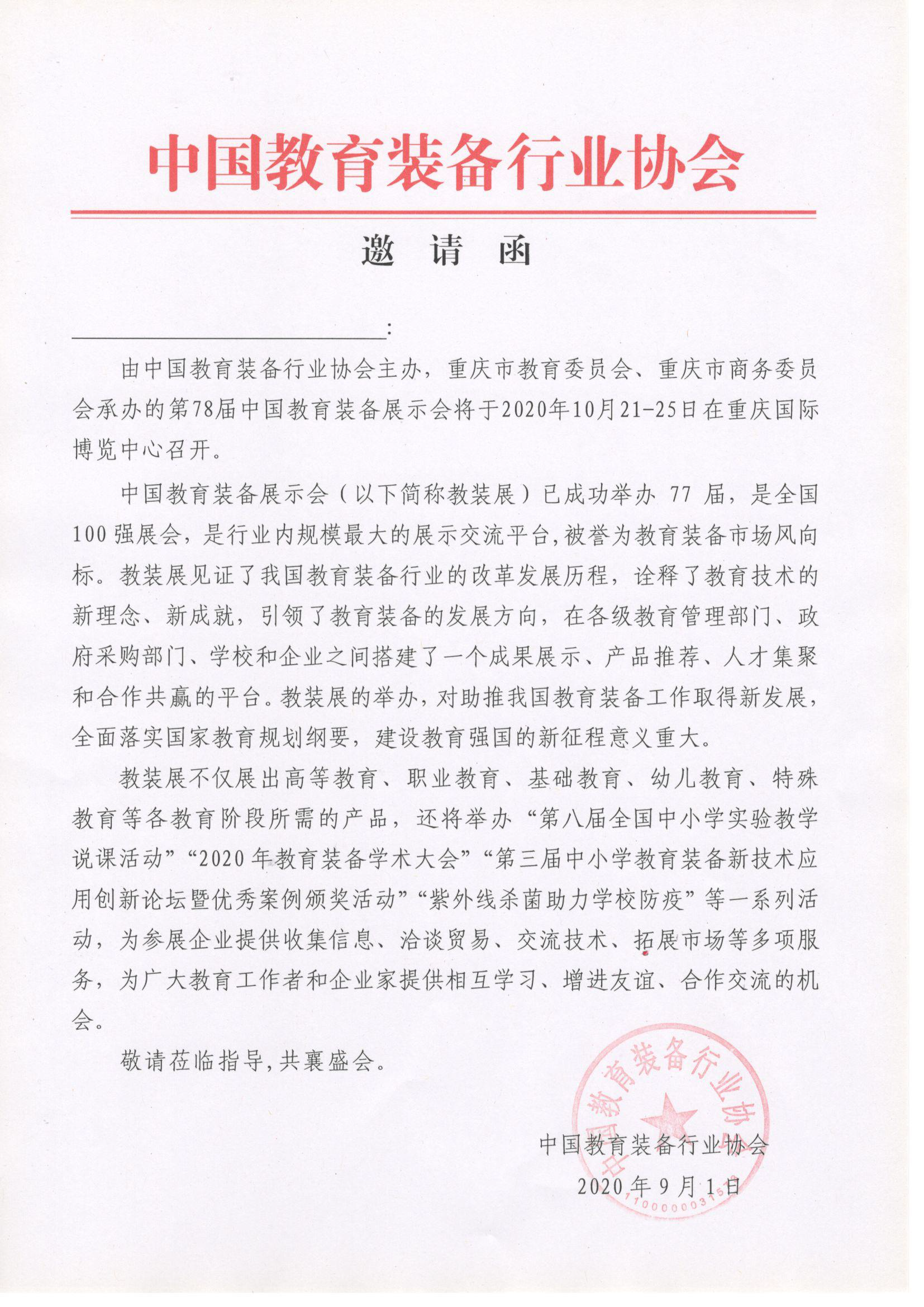 由中國教育裝備行業協會主辦,重慶市教育委員會、重慶市商務委員會承辦的第78屆中國教育裝備展示會將于2020年10月21-25日在重慶國際博覽中心召開。