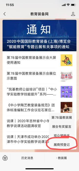2.手機端:掃描并關注“教育裝備網公眾號”(見圖2),點擊“教裝展”選擇“展商預登記”(見圖3);選擇“參展商實名登記”,按照程序步驟填報參展相關信息。