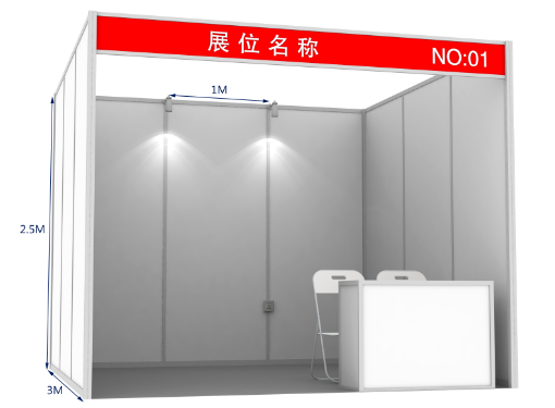 每個標準展臺包含:咨詢桌1張(H750X500X100),折椅2把,電源1處500W,射燈2盞。