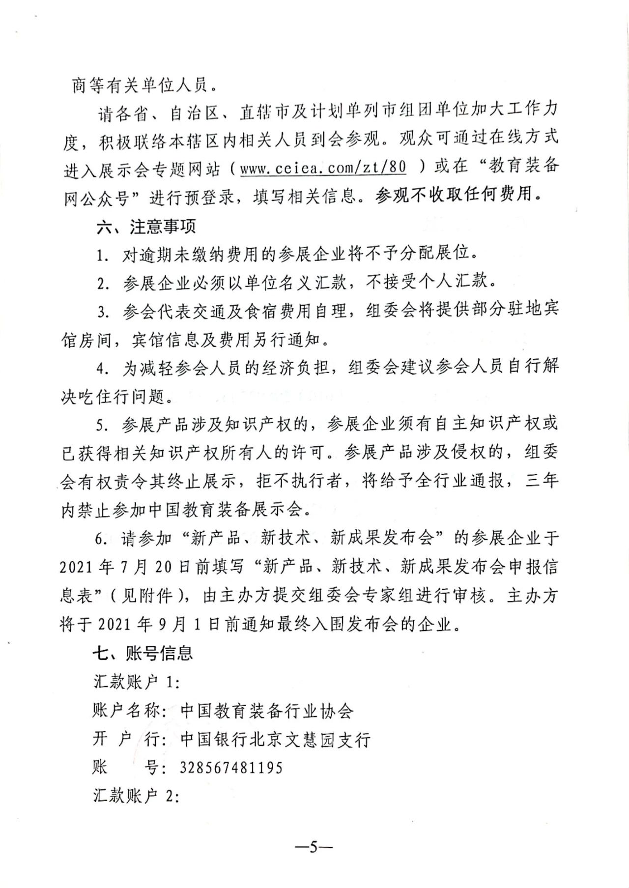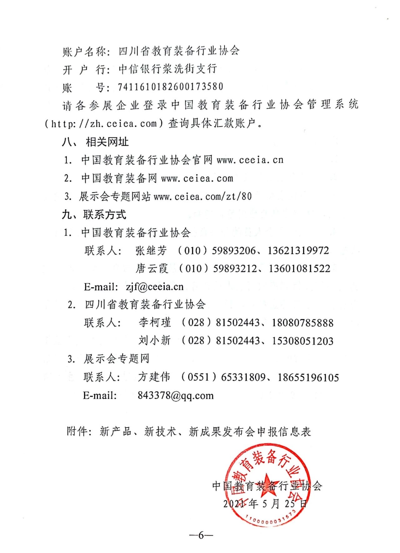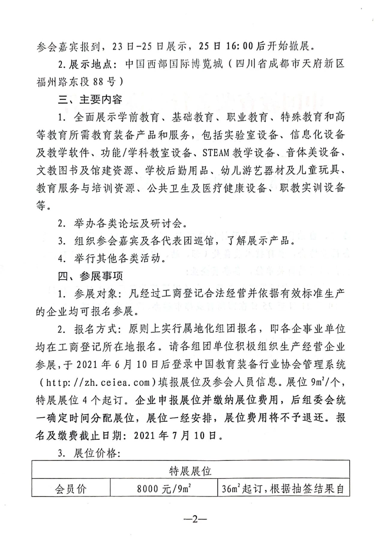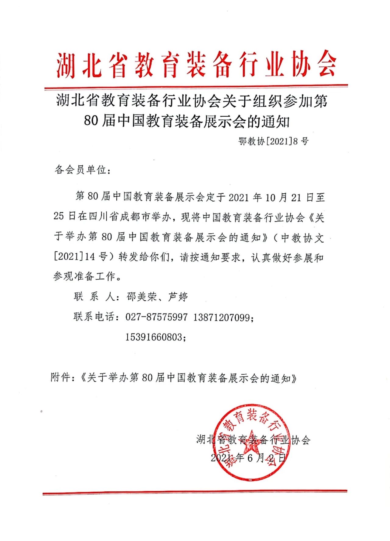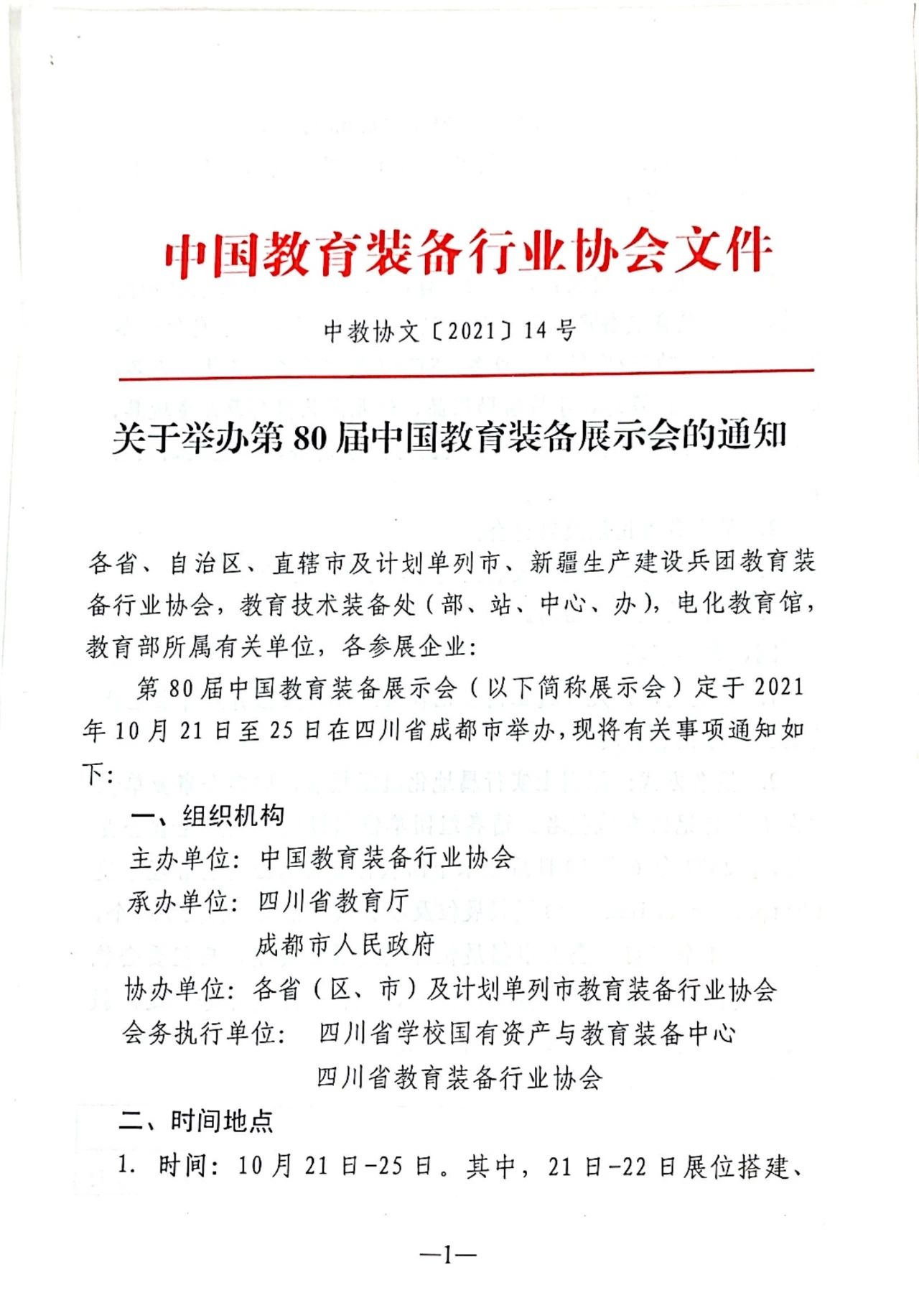 第80屆中國教育裝備展示會(huì)定于2021年10月21日至25日在四川省成都市舉辦,現(xiàn)將中國教育裝備行業(yè)協(xié)會(huì)《關(guān)于舉辦第80屆中國教育裝備展示會(huì)的通知》(中教協(xié)文[2021]14號(hào))轉(zhuǎn)發(fā)給你們,請(qǐng)按通知要求,認(rèn)真做好參展和參觀準(zhǔn)備工作。