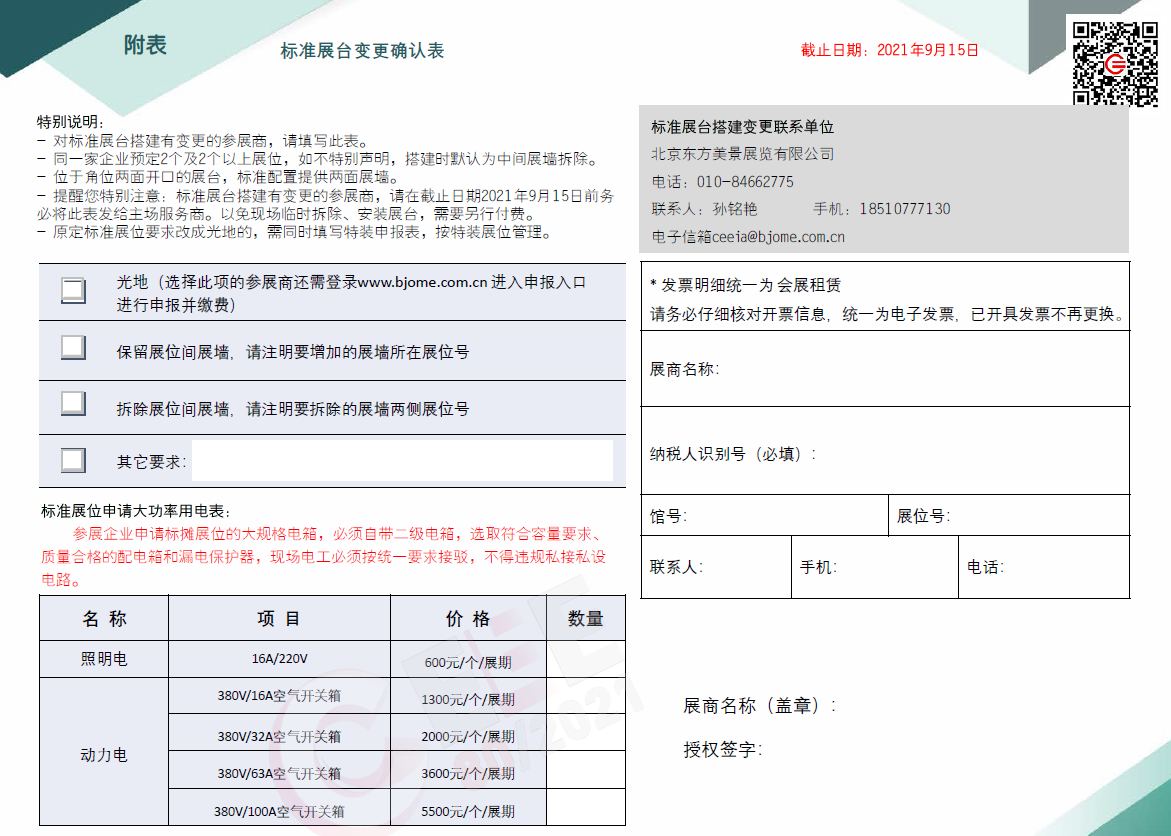 -請參展商通知各自的搭建單位務必于2021年9月15日17:00前與北京東方美景展覽有限公司聯系辦理施工申請手續,交納相關費用。逾期未辦理申報手續,將產生滯納費用,詳見各附表。