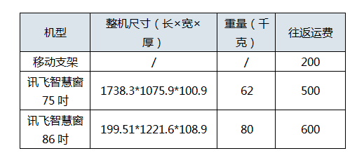 訊飛智慧窗大屏設備單臺往返運費及設備規格(加壁掛厚度增加30mm)如下: