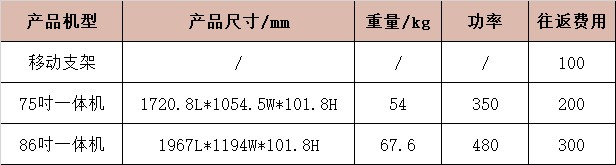 交互智能平板設備單臺往返運費及設備規格(加壁掛厚度增加30mm)如下: